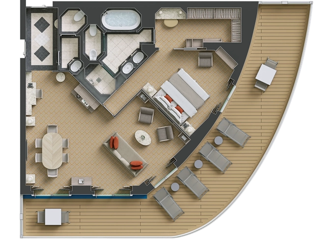 | R1 - Royal Suite 1 105 m² (vrátane balkónu). 7. paluba vpredu. Max 3 osoby. | 23 600 € 23 600 € za osobu |