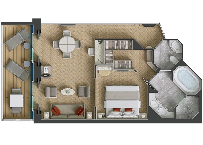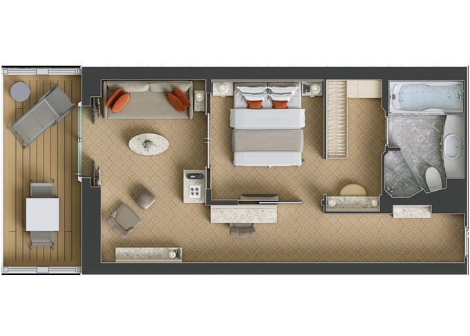 | SV - Superior Veranda Suite 30 m² + balkón 6 m². 7,8,9. paluba. Max 3 osoby. | 14 000 € 14 000 € za osobu |