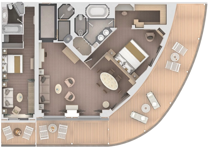 | S2 - Silver Suite 2 92 m² + 12 m². Silver Suite SL spojená s Panorama Suite PA. 9,10,11. paluba. Max 5 osôb. | 44 800 € 44 800 € za osobu |