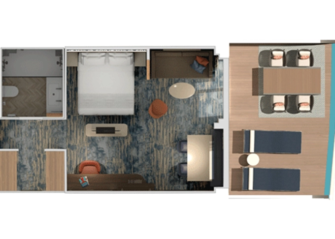 HG - Kajuta Havana Cabana s väčším patiom 19 m² + vonkajšie patio 9 m². 8. paluba vpredu. Tropický štýl, vstup do exkluzívnej zóny Havana. 3 026 € 1 513 € za osobu