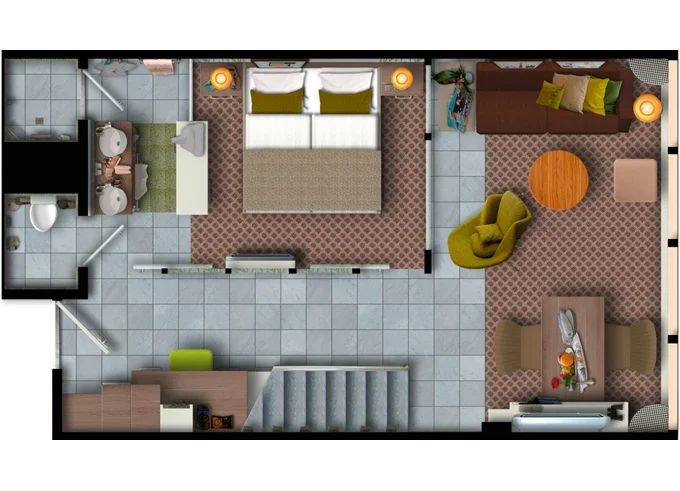 SUTO - Themen Suite 54 m² + balkón 15 m² so stolom, ležadlom a hojdacou sieťou. Spálňa, obývacia časť, šatník. 10. paluba. Max 4 osoby. Výhody Suite. 5 256 € 1 314 € za osobu