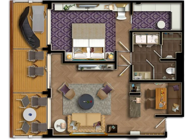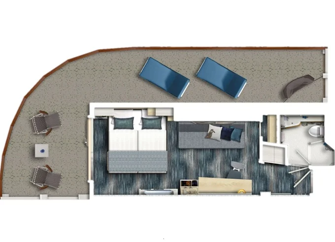 SUTO - Themen Suite 54 m² + balkón 15 m² so stolom, ležadlom a hojdacou sieťou. Spálňa, obývacia časť, šatník. 10. paluba. Max 4 osoby. Výhody Suite. 5 056 € 1 264 € za osobu